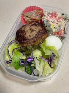 セブンイレブンで買った、ゆでたまご、ハンバーグ、レタス、カニカマサラダ、冷食のきんぴらごぼうをオン。
