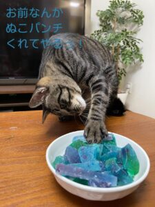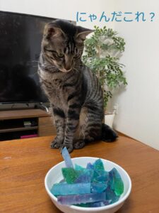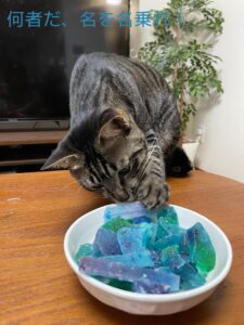 息子の作った琥珀糖をいぶかしがるぬこ様。