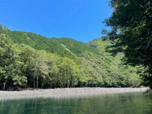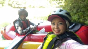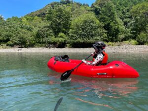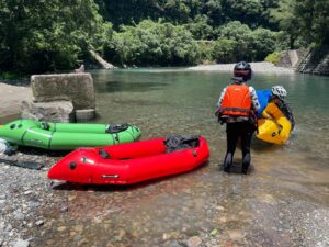 バイクに積んだボートに空気を入れて、ドンブラコ。