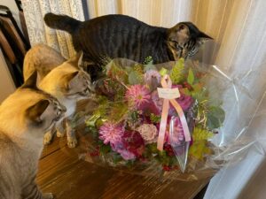お花持ち帰ったら、ヌコ様達が興味津々で寄ってきましたw
